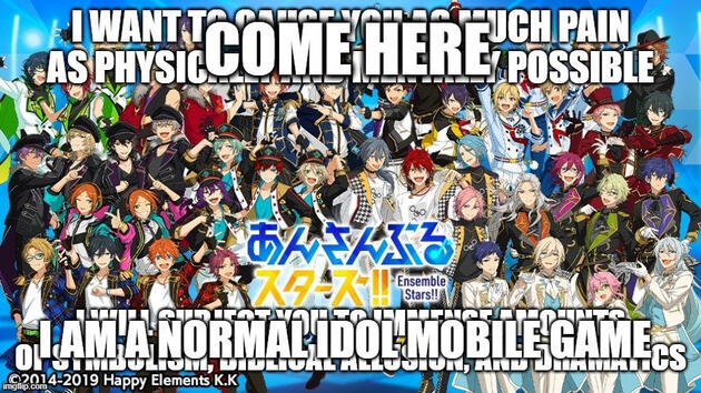 i f ucking hate ensemble stars it is rotten and evil experiencing it is a living hell i am forced to avoid it at all costs and yet it still holds me captive in its claws there is no escape every day it plagues my brain to no end